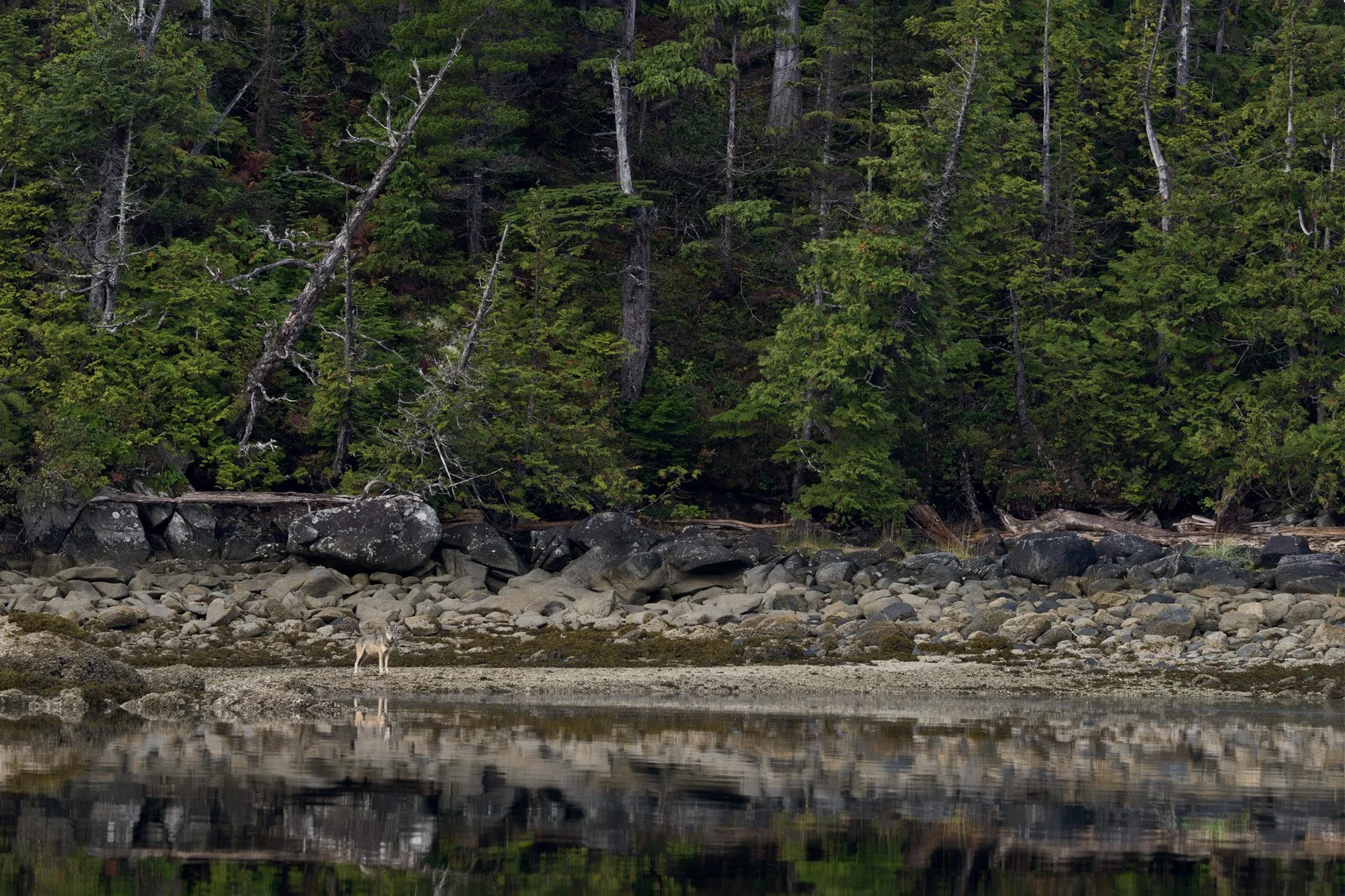8–10x Medium wolf-in-context (wolf by shoreline, tiny against cliffs).
