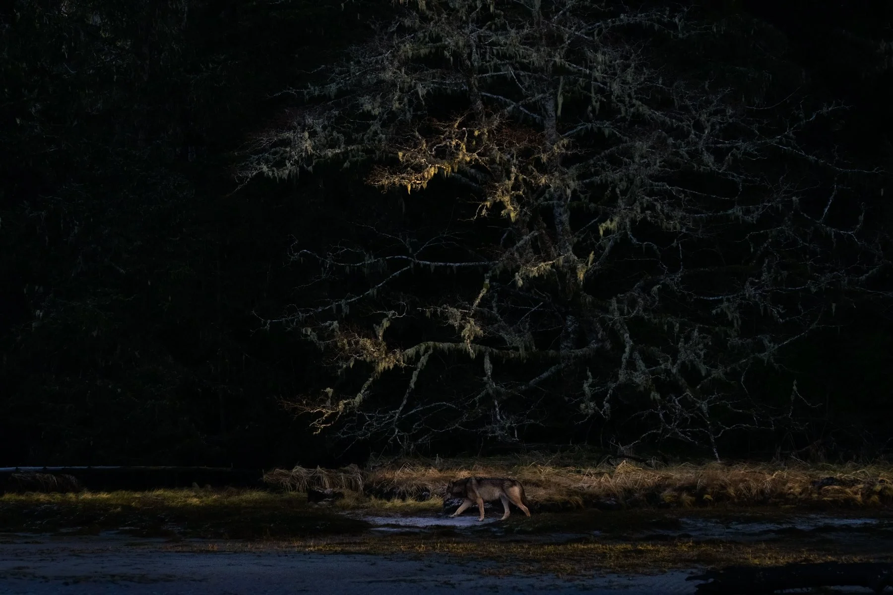 8–10x Wolf as suggestion (silhouette in fog, shape moving between trees, reflection).