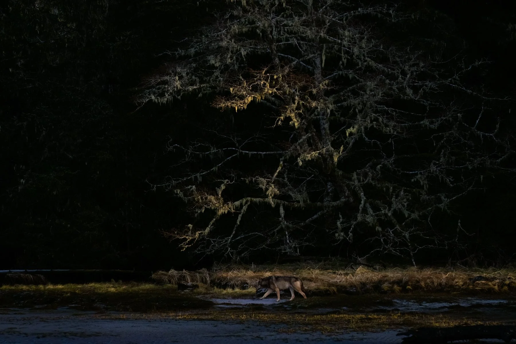 Cinematic sequences emerge — wolves moving along tidal flats, navigating rocky outcrops, weaving in and out of visibility.