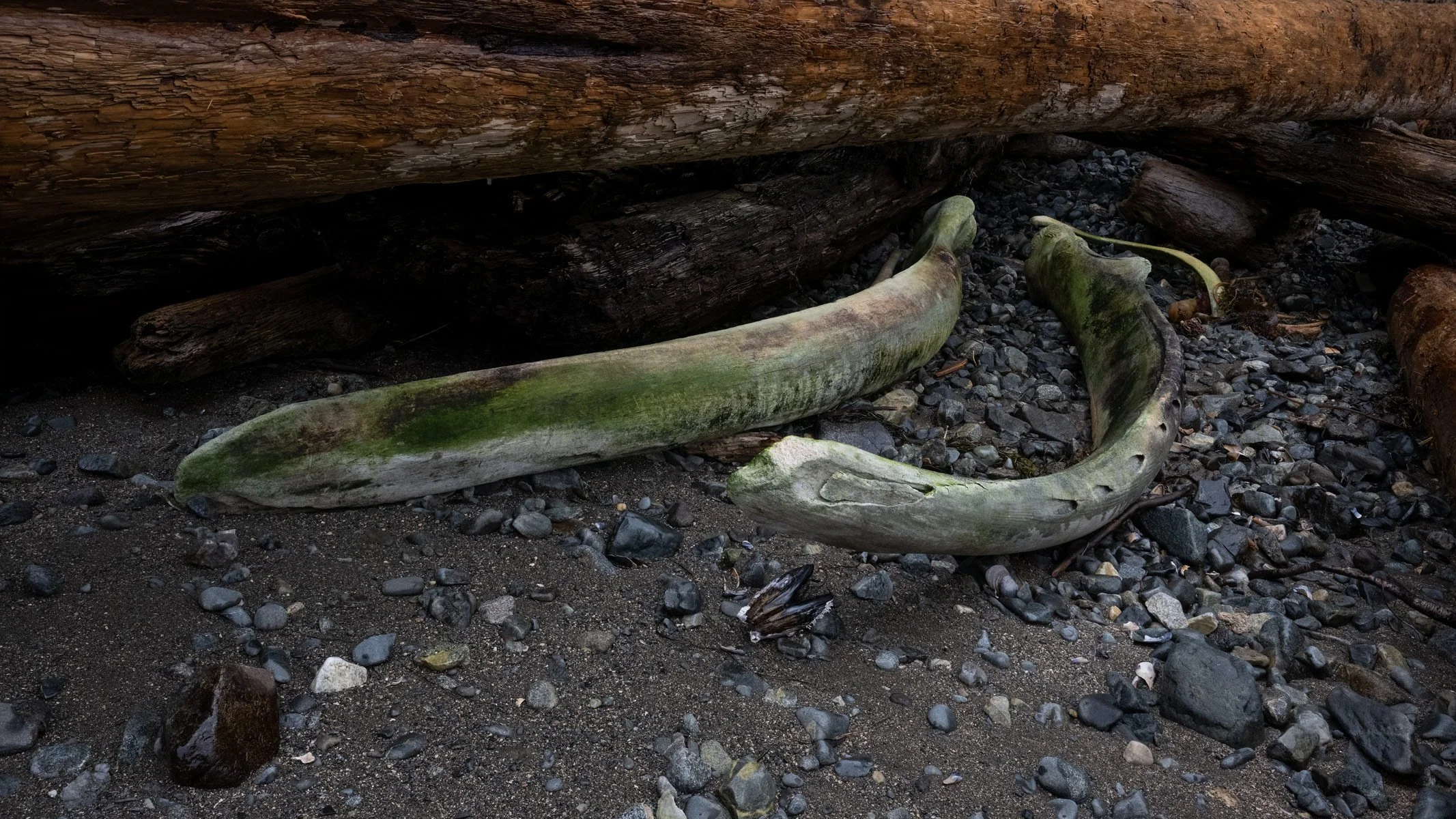 5x Symbolic fragility (abandoned den, washed bones, print erased by tide).