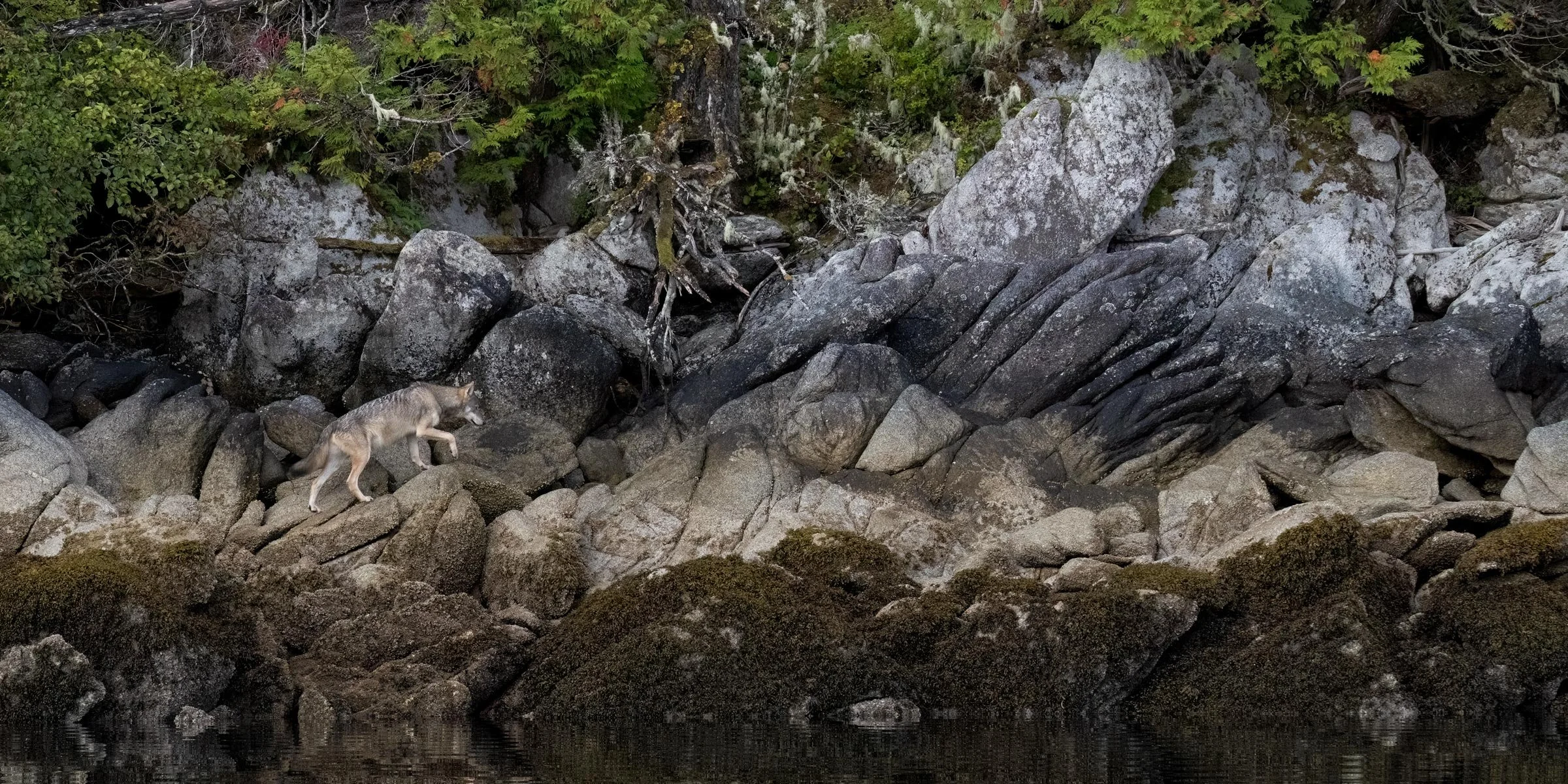 8–10x Wolves dwarfed by scale (tiny in vast seascapes, cliffs, ancient cedar groves).